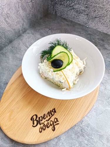 Состав: печень куриная, картофель, морковь, сыр, яйцо, огурец соленый, майонез