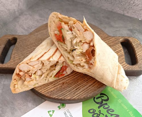 Состав: курица, салат пекинский, помидоры, сыр, сухарики, соус Цезарь.