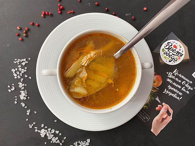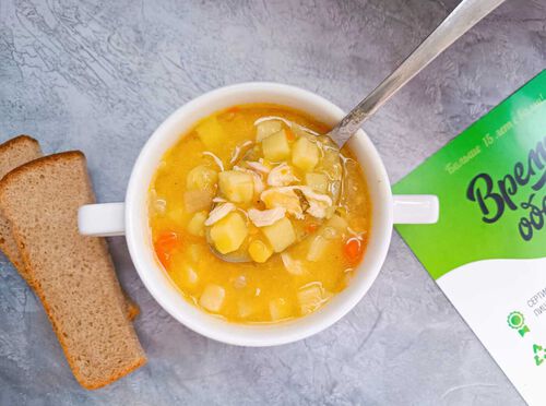 Состав: горох, картофель, морковь, зелень, лук, курица, масло растительное, специи.