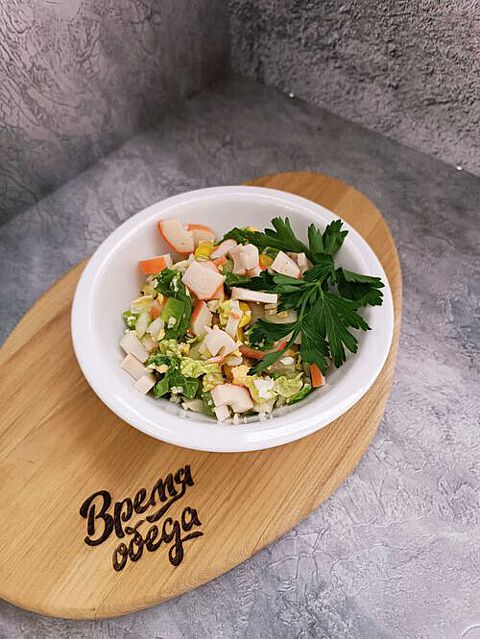 Состав: крабовые палочки, пекинская капуста, кукуруза, огурец свежий, яйцо, майонез